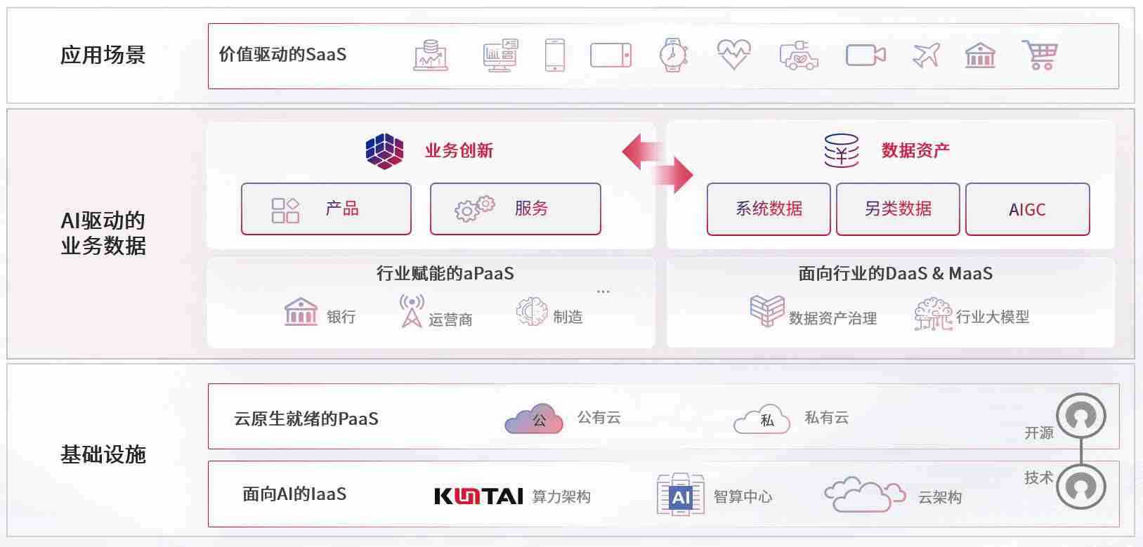 数字时代,,,,围绕企业数字化转型的关键要素,,AG尊龙凯时数码开创性的提出数云融合战略和技术体系框架,,,着力在云原生、、、数字原生、、AI原生和信创产业上架构产品和服务能力,,,为处在不同数字化转型阶段的快消零售、、汽车、、、金融、、、、医疗、、、、政企、、教育、、、、运营商等行业客户提供泛在的敏捷IT能力和融合的数据驱动能力,,构建跨界融合创新的数字业务场景和新业务模式,,,,助力企业级客户建立面向未来的核心能力和竞争优势,,,全面推动社会的数字化、、智能化转型升级。。。