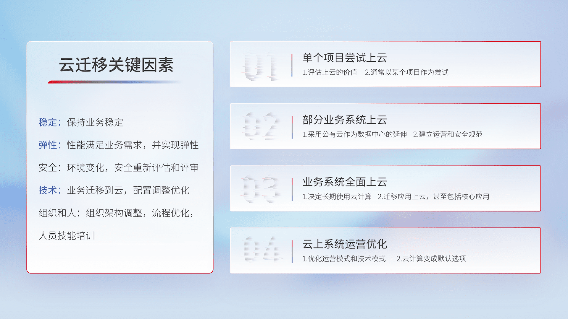 结合实际业务,,,,从规划设计、、、、云平台选型、、云原生改造、、数据迁移、、、集成交付,,,,迁移全过程为客户识别最佳上云路径,,,,做好风险识别管理,,设计网络架构、、、、身份权限、、、、安全审计合规、、操作审计、、日志审计、、监控告警策略、、、、多站点容灾设计等,,对云上基础设施进行整体规划,,,提升IT治理水平,,,,以满足弹性、、、、高可用、、、、高性能的需求。。。