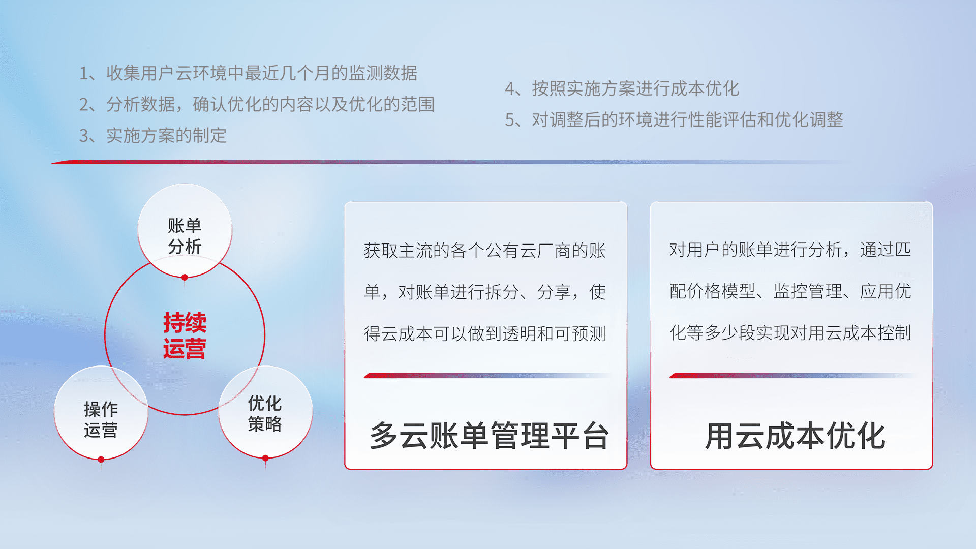 通过多云纳管,,以统一的资源数据模型把客户的云资源进行抽象和封装,,进而实现对多云资源的统一操作,,,,保障云资源管理的可靠性、、、、稳定性与可用性。。量身定制化运维内容,,配置、、、开发运维、、、、补丁管理、、、、备份、、监控、、、、认证和访问管理、、、审计和日常巡检等,,,保障在用云过程中的可靠度,,,稳定度以及高可用率。。。。